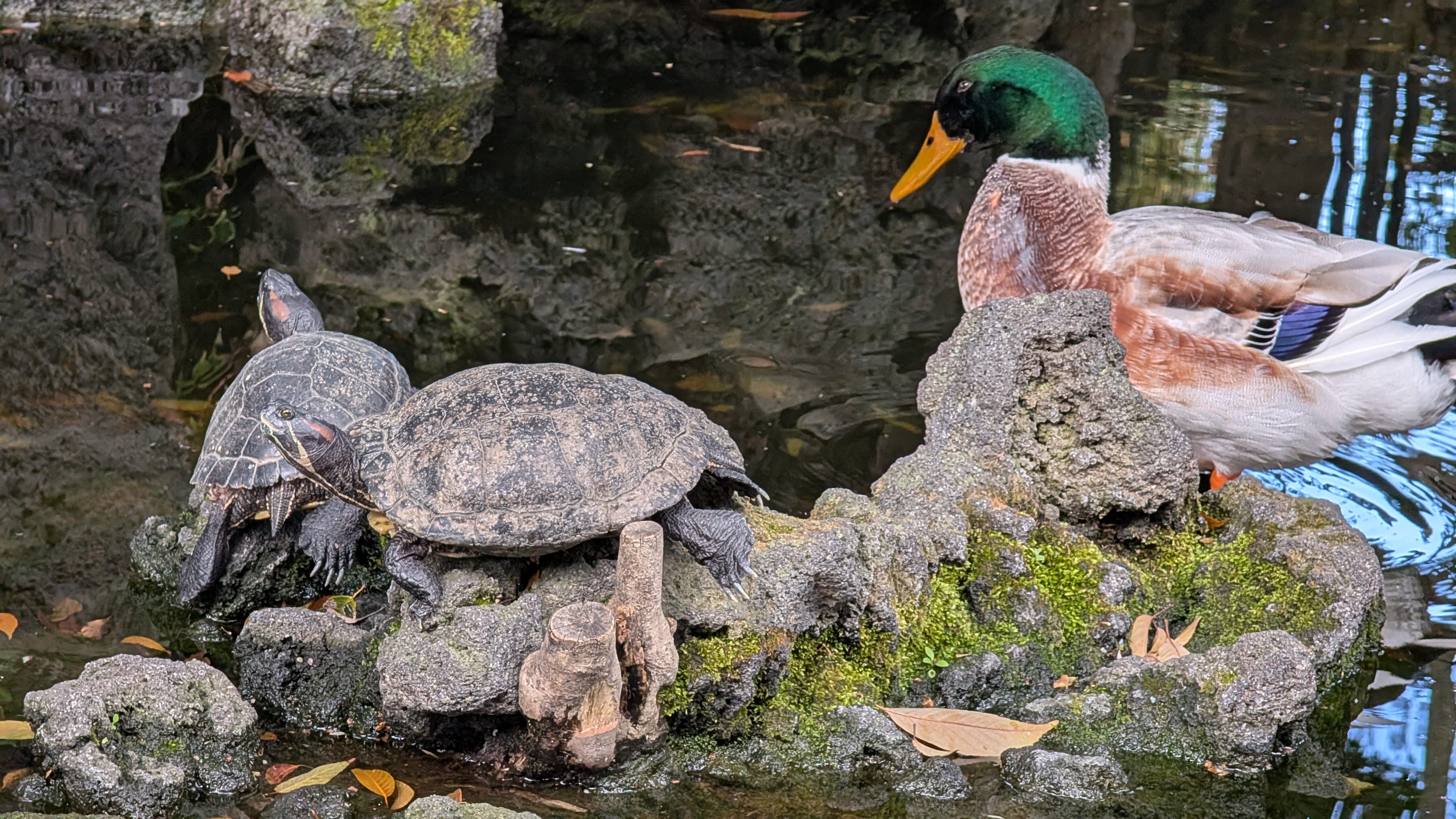 I’m sitting on a bench near a pond in Hachimangu Shrine, watching a male mallard duck stare at two red-eared sliders sunbathing on a rock. It is Friday. A second ago, I considered getting up, but I don’t have anywhere I really need to be. I focus on the sound of the small waterfall, honing in on the noise the water makes when it splashes against the rock. How long has this waterfall been here? This shrine has existed for nearly a thousand years, so I truly have no idea. The corner of my eye catches a rogue koi fish, swimming silently. He seems to have his own routine. I watch him do a couple of laps, and wonder how many laps he’s done in his life in this pond.